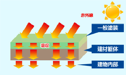 一般塗料の場合 ![]() 屋根や外壁への熱の原因となってしまう赤外線を旧塗膜 が吸収する。この熱が建物に伝わっていき、建物の内部 温度を上昇させてしまう場合もあります。 |