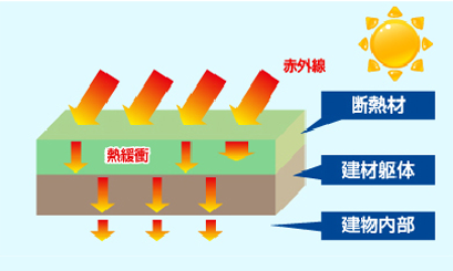 断熱材の場合 ![]() 熱が建物に伝わるのを抑える為に断熱材があります。断熱 材は、外からの熱を内部に伝わりにくくし、温度の上昇を 抑えてくれます。 |