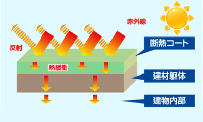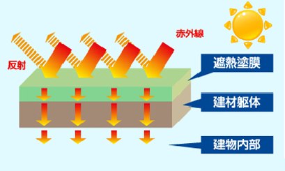 遮熱塗料の場合 ![]() 各部位に、遮熱塗装を行うと、赤外線を反射して温度 上昇を抑え、内部の温度の上昇を抑える効果があります。 |